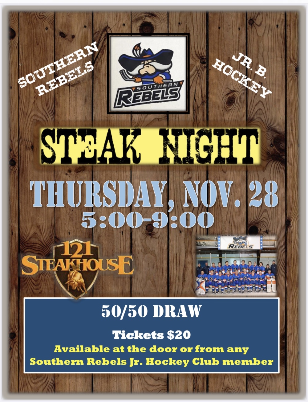 Join the Southern Rebels Jr. B Hockey Club at 121 Steakhouse for steak/chicken and all the fixings! $20 tickets available at the door. 50/50 draw.