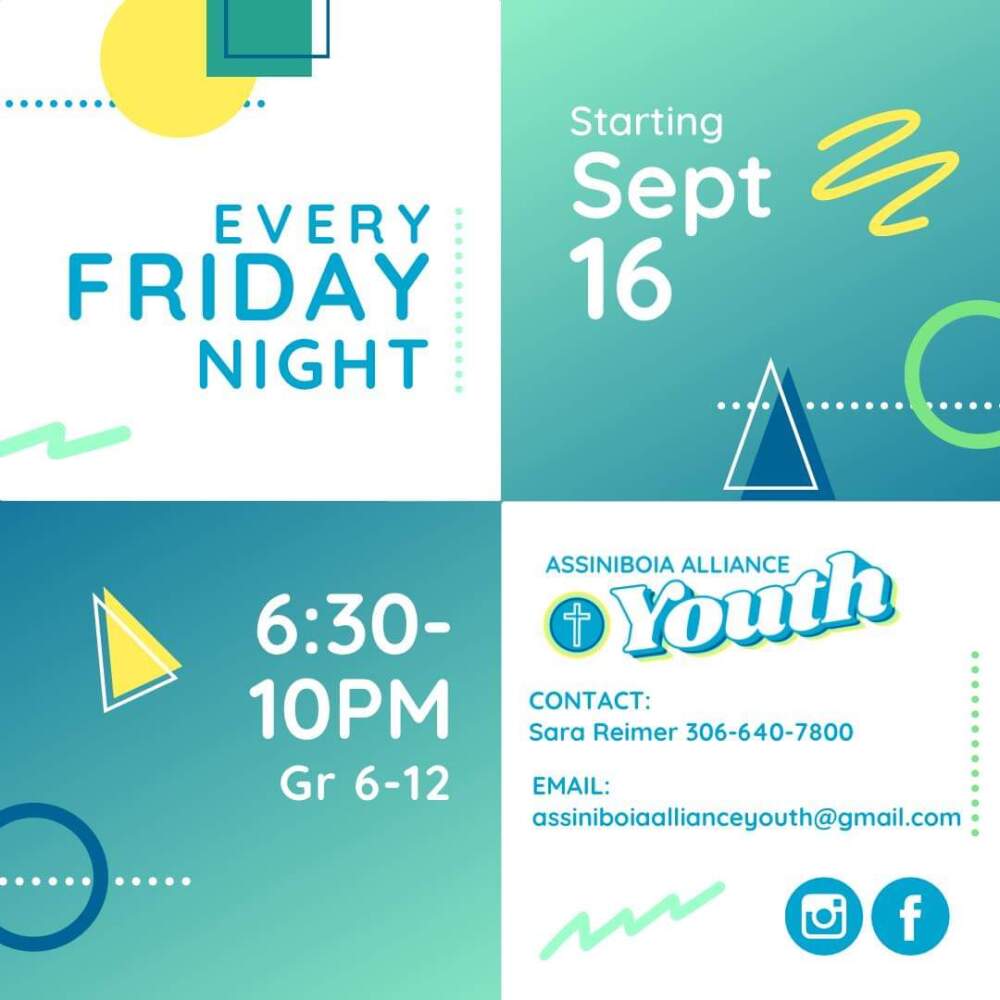 Assiniboia Alliance Church youth group is open for Youth grade 6 to 12. We meet Fridays at the Assiniboia Alliance Church. We offer games, a Biblical lession, snacks and a place for youth to hang out.