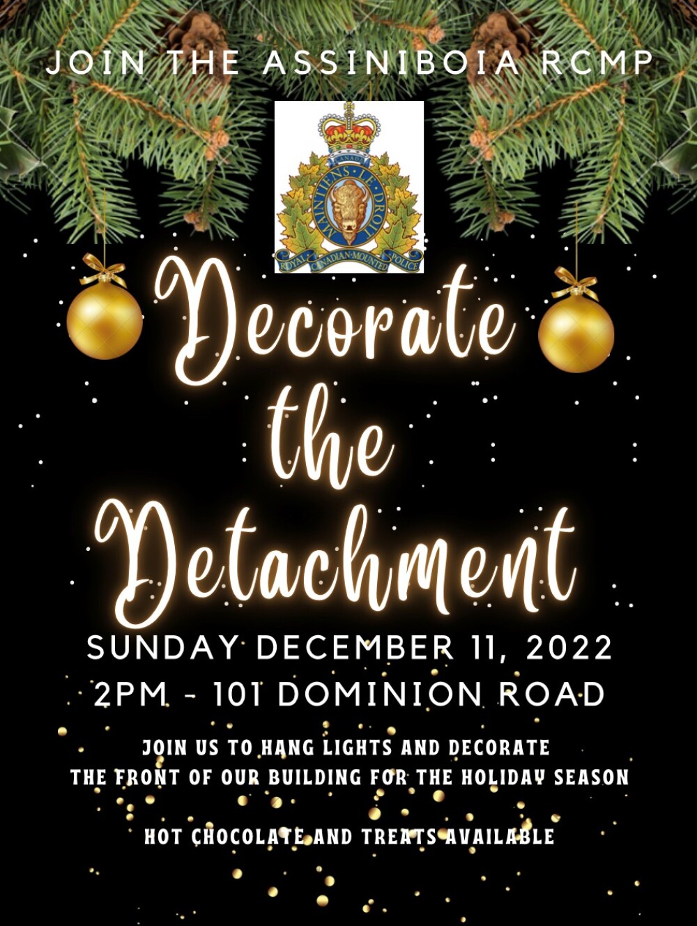 Join the Assiniboia RCMP at their detachment and help them hang their lights and share in the holiday spirit! Hot Chocolate and treats available for all helpers!