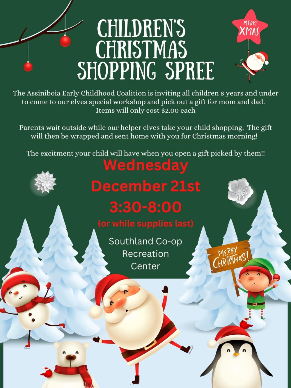 The Assiniboia ECC is inviting all children 8 years and under to come to our elves special workshop and pick out a gift for Mom and Dad! Items will only cost $2 each.