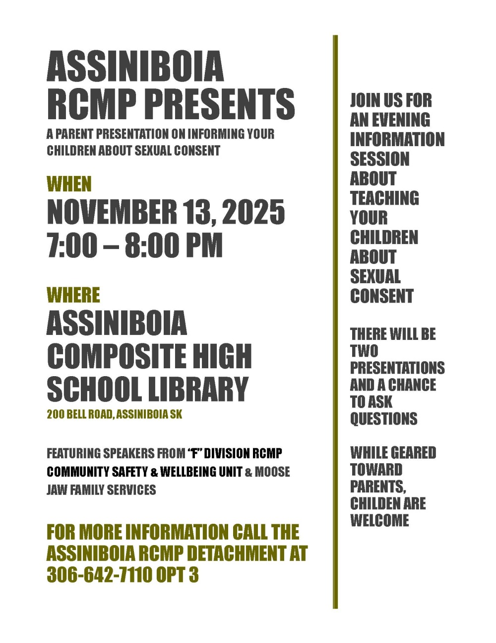 The Assiniboia RCMP Detachment presents a parent information session on informing your children of the importance of sexual consent and how to have those conversations.