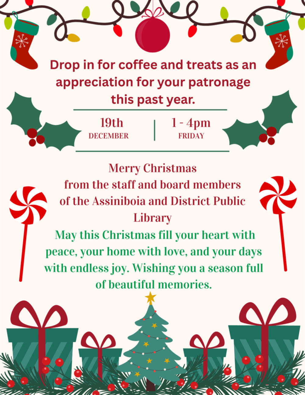 Drop in for coffee and treats on Friday Dec 19th between 1 & 4 as an appreciation for your patronage this past year. Merry Christmas from the staff and board members of the Assiniboia and District Public Library. May this Christmas fill your heart with peace, your home with love, and your days with endless joy. Wishing you a season full of beautiful memories.