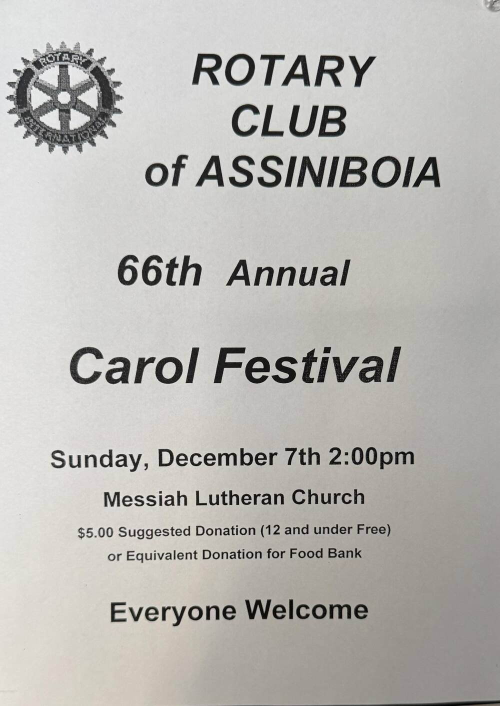 The Rotary Club of Assiniboia presents the 66th Annual Carol Festival. Sunday, December 7th at 2:00 pm at the Messiah Lutheran Church. $5 suggested donation (12 and under free) or an equivalent donation for the Food bank. Everyone Welcome
