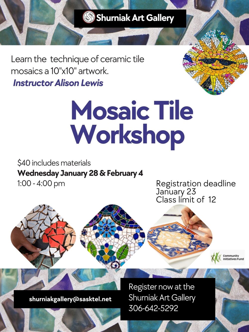 Join us for the exciting opportunity to make your very own Mosaic Tile at the Shurniak Art Gallery.