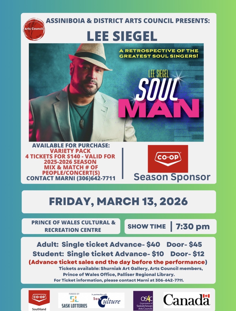 Please join us for an evening of amazing music as Lee Iegel takes the stage for his Soul Man tour with OSAC. Tickets are available from the Shurniak Art Gallery, the POW office, the Assiniboia Library and online at www.assiniboiaartscouncil.ca (click on SHOP).