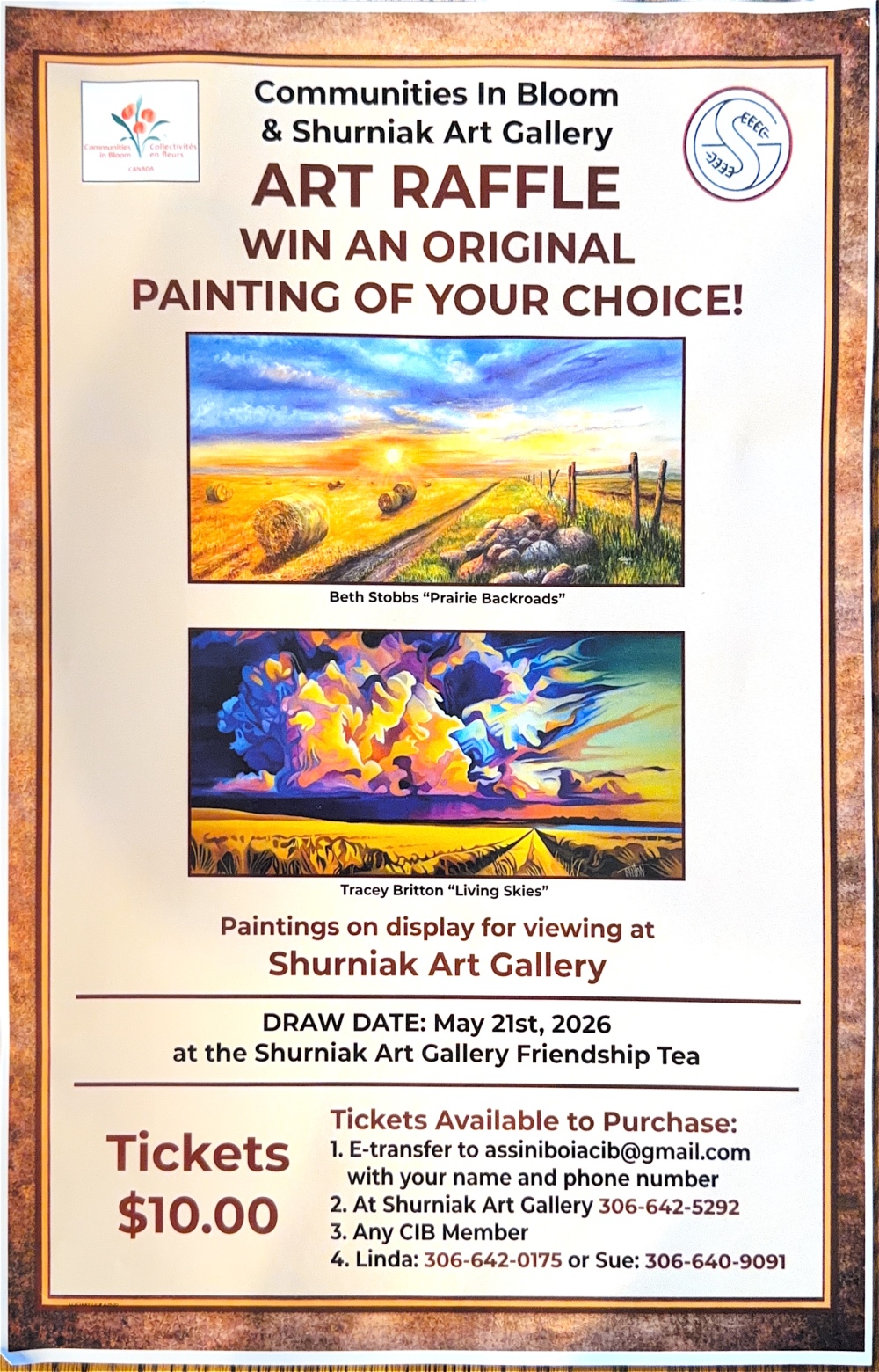 Raffle Tickets are available at the Shurniak Art Gallery, from CiB members or through e-transfer with a name and phone number.