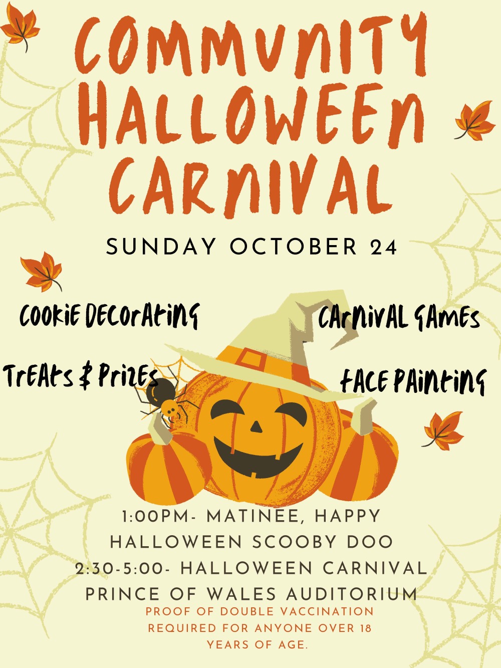 Matinee movie at 1:00, followed by the Halloween Carnival at 2:30